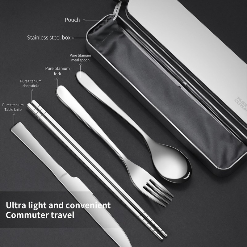 - What do you get? : Zing tti 4-piece set of titanium tableware with box: including 1x Titanium Chopsticks, 1x Titanium Knife, 1x Titanium Fork, 1x Titanium Spoon, and 1x stainless steel travel tableware suitcase, ... Applicable to restaurants, travel, camps, schools or workplaces...