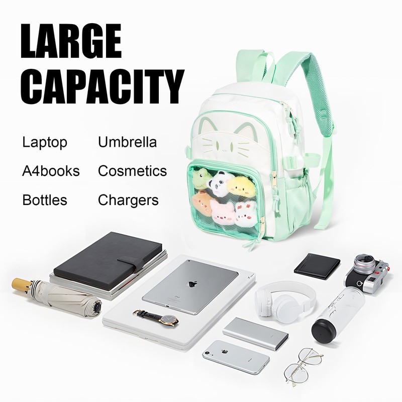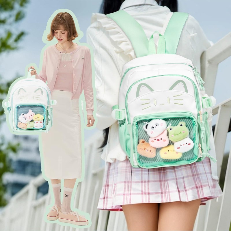 ZingZaak Kawaii Cat Ita Bag,Pin Purse,Pin Display Backpack Bag with Insert,For Daily Use and Cosplay,Gift for girls(green-white, Small)