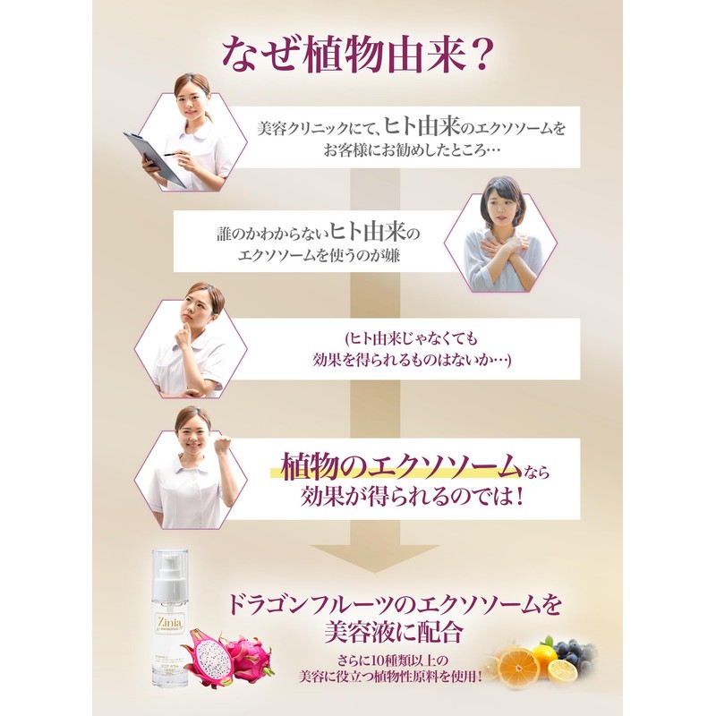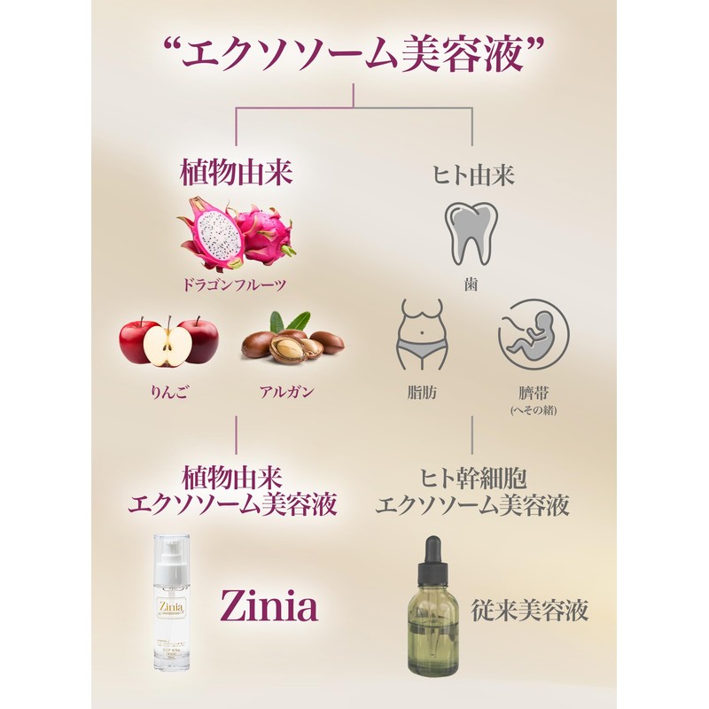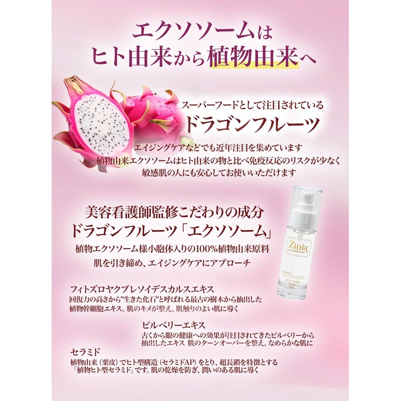 - ✅【新発想の美容液】Zinia(ジニア) エクソソーム美容液は『誰のか分からないヒト由来エクソソームを使用することに抵抗がある』というお客様の声から商品開発に至った植物由来原料のみを配合したエクソソーム美容液です。