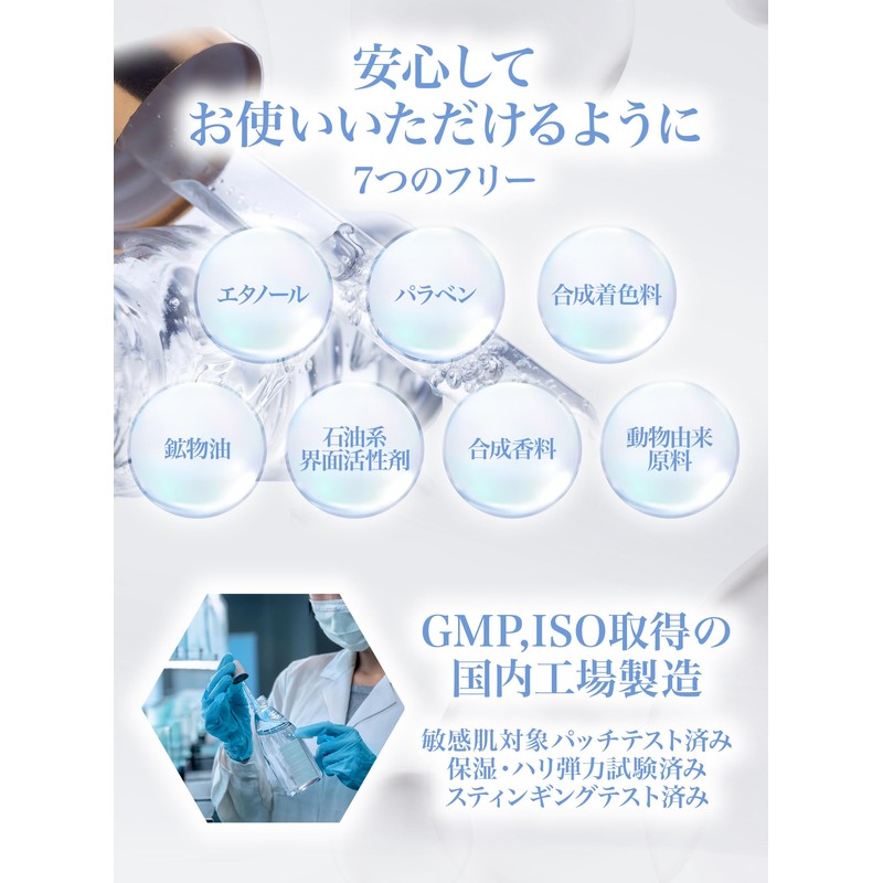 - ✅【フリー成分】以下の7つのフリーを実現しております。 (エタノール/パラベン/合成着色料/鉱物油/石油系界面活性剤/合成香料/動物由来原料) またGMP,ISO取得の国内工場にて1つずつ丁寧に製造しております。