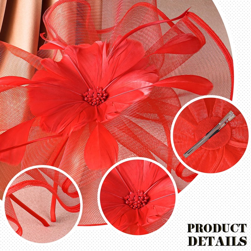 Zinniday Women Fascinators Hat Headband - Red Victorian 2025 Feather Tea Party Hats with Hair Clip, Flower Kentucky Hats 20s 50s Mesh Derby Fascinator for Women Cocktail Church Ball Costume Headwear