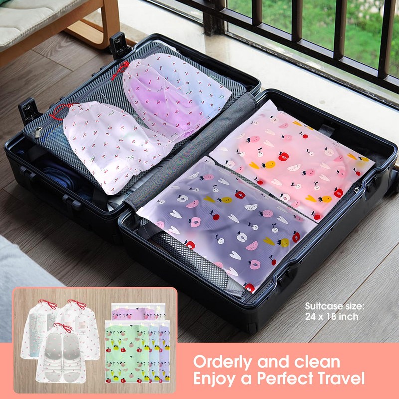 - 【Quality Material】:The plastic drawstring bag are made of high quality PEVA plastic, waterproof and dustproof, lightweight but durable, odorless and reusable, can guarantee a long time use. Travel pouches for clothes are very suitable for organizing clothes and keeping them in order.
