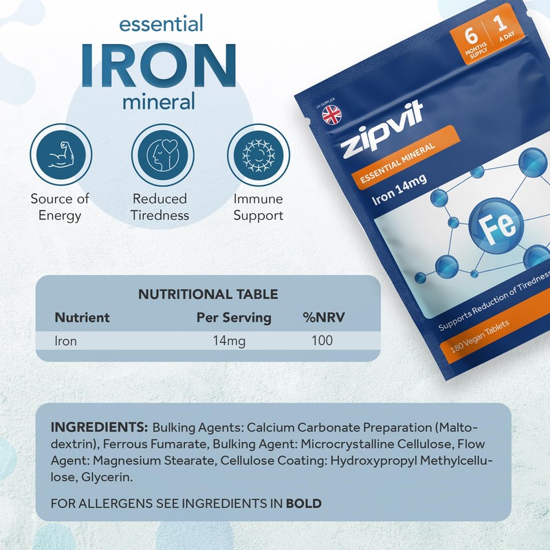 - WHY CHOOSE ZIPVIT IRON TABLETS? Our Iron tablets contain 14mg of Iron ferrous fumarate, a gentle, easily absorbed form of Iron that's kind on the stomach. Ideal for daily use, they support energy, cognitive function, immune health, and overall well-being. Designed to be vegan-friendly, easy to swallow, and free from any unpleasant aftertaste, our iron tablets are a convenient choice for supporting your health.