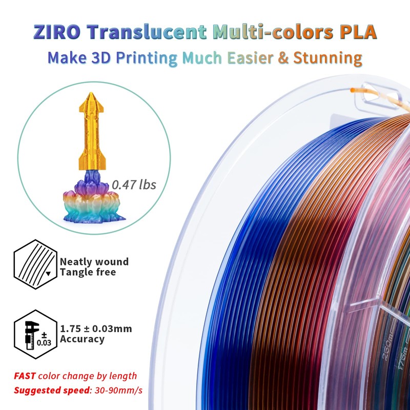 - [Fast Color Changing PLA]- The ZIRO "Crystal Prism" combined multiple bright colors with semi-transparent PLA base. Higher-cost production technology to achieve the true faster color changing aim. It's creative color design & translucent feature offering a super stuning look, giving your 3D works a unique style. (Different thickness of model's wall will show different light transmittance )