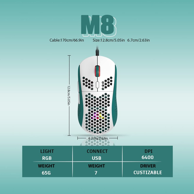 - mouse ligero para juegos de 69 g: los ratones ligeros para juegos tienen una elaborada carcasa perforada en forma de O que pesa solo 2.43 onzas (69 gramos). El diseño profesional reduce en gran medida el peso del mouse, haciendo que el mouse sea más flexible en la manipulación y reduciendo la fatiga de la mano tanto como sea posible durante un uso más prolongado.