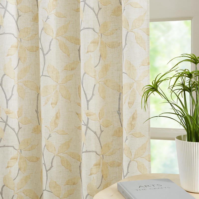 ZJDECOR 95 Inches Long Semi Sheer Curtains for Bedroom Living Room,Printed Botanical Yellow Leaf Grey Branch on Linen Blended Fabric,Rod Pocket Back Tab Window Treatment with Tapes,38" Wx95 Lx2