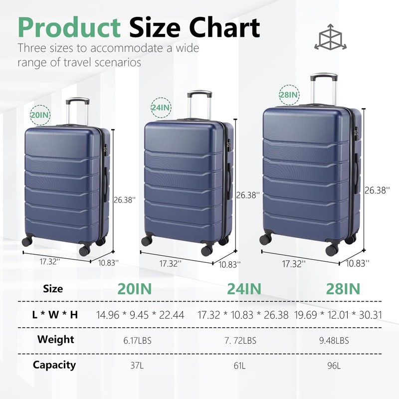 ZJMTOCYU Expandable Hard-Sided Suitcase with Smooth 360° Rotating Wheels, TSA Lock, and Adjustable Handle - 20" to 28" - Blue, 3-Pack