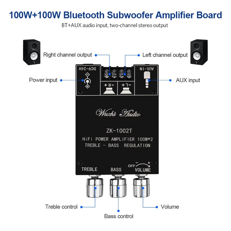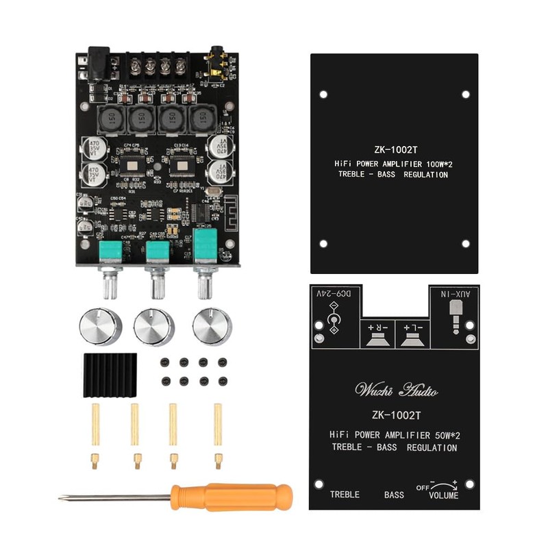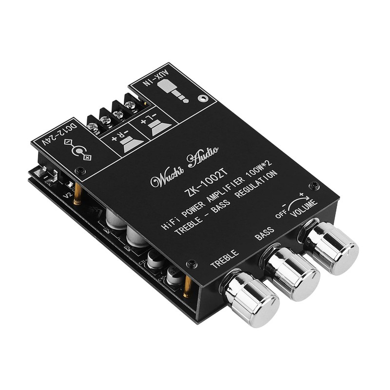- 【Audio Power Amplifier Board】ZK-1002T with 100W+100W power output and Bluetooth 5.0 wireless connection function, Bluetooth+AUX input, 2.0 channel stereo output, just a little sound distortion. Treble and Bass control. More functions on the APP waiting for you to discover. Note: When using AUX mode, please confirm that the Bluetooth connection of this module has been disconnected