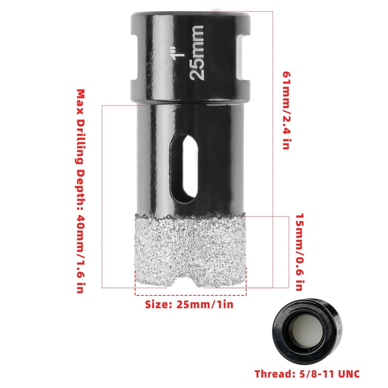 - 【Specification】Max drilling depth: 40mm/1.6 in, overall length: 61mm/2.4 in, diamond height: 15mm/0.6 in, thread: 5/8-11 UNC