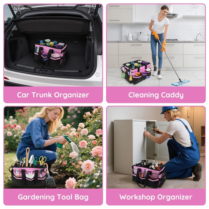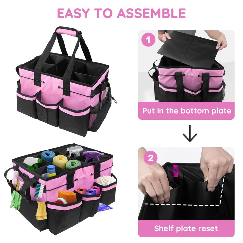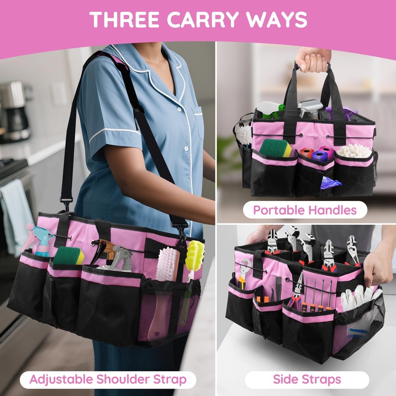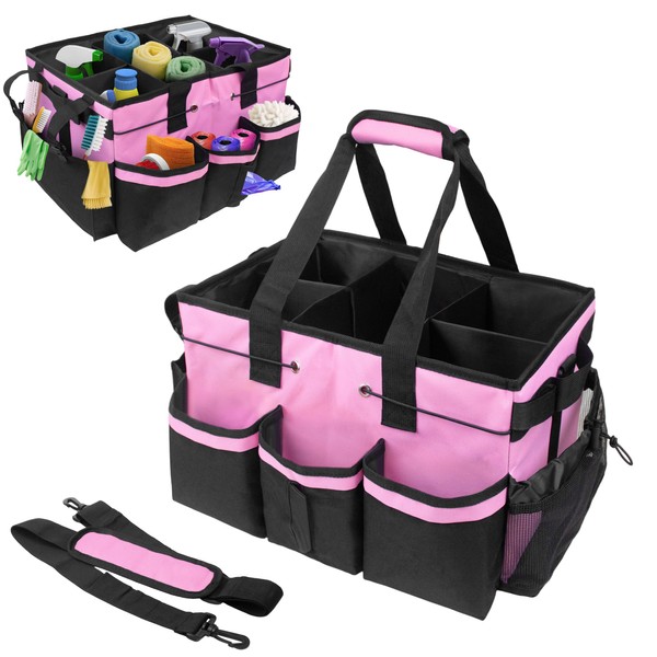 ZKOO Large Cleaning Caddy Bag with Handle, Built-in Sturdy Support Board, Adjustable Shoulder Strap, Multi-compartment Design Cleaning Supply Tote for Cleaners & Housekeepers (Pink)