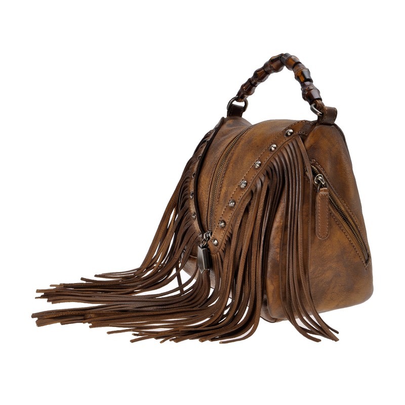 ZLYC Women's Leather Bamboo Hand Strap Featured Fringe Bohemian Tassel Studed Cross Body Bag, Brown, One Size