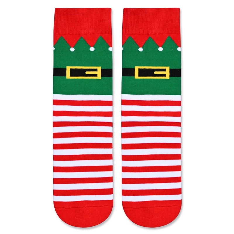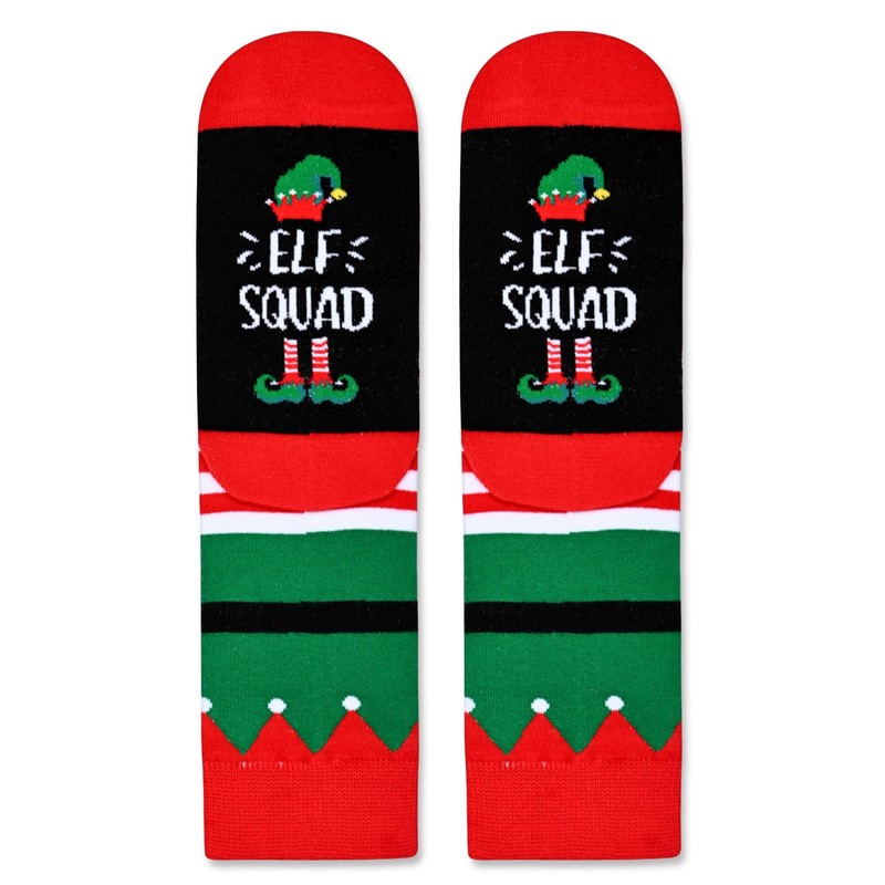 - ELF CHRISTMAS SOCKS: These holiday socks feature a playful design with Santa's belt patterns and white fluff ball patterns, complemented by neat red stripes. The bottom of the ELF socks has a hilarious hidden message that reads "ELF SQUAD".