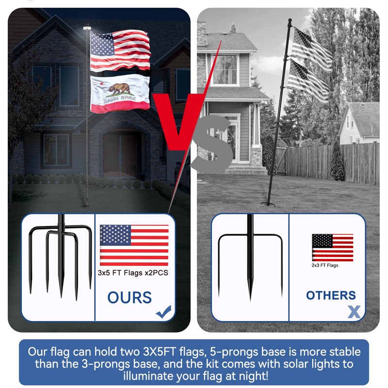- 5 Prongs Base: The upgraded 5-prong design offers more stability than 2 or 3 prongs. It firmly anchors in the soil, ensuring the flagpole stays upright. Ideal for residential or commercial use