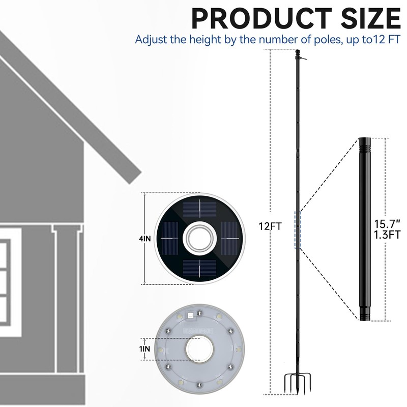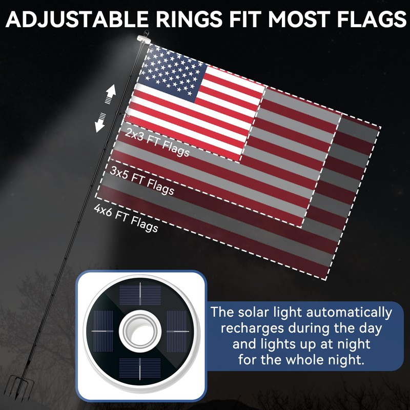 - Upgraded design: Features smooth 360° rotating flagpole rings for tangle-free fluttering, along with a solar-powered light for elegant illumination from dusk till dawn