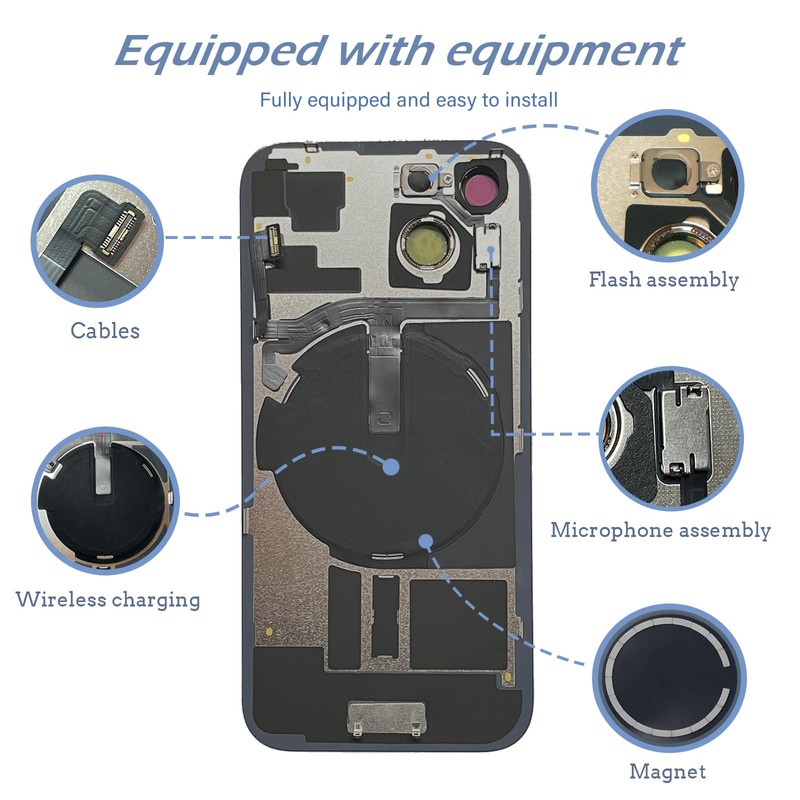 - ProductsThe 15(6.7 inches,Black) rear cover glass provides a superior grip and an integrated camera module.Inside the product is a metal bracket that houses a wireless charging module,cables, microphone assembly and flashlight.Ensuring your device maintains its premium look and functionality.