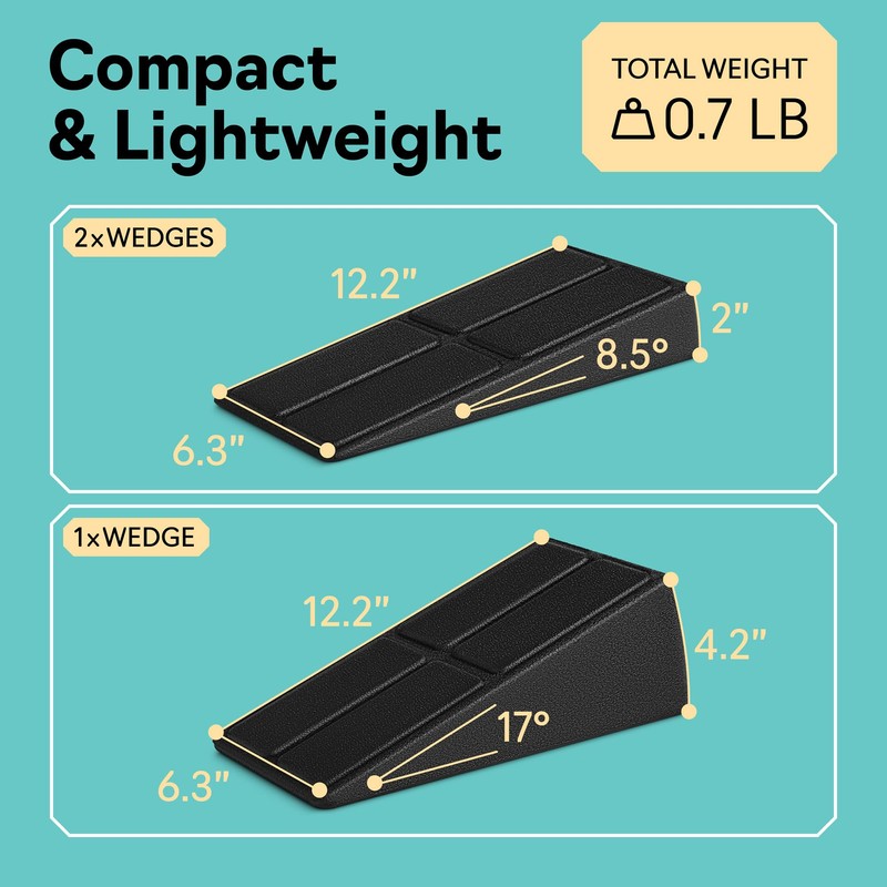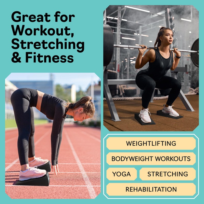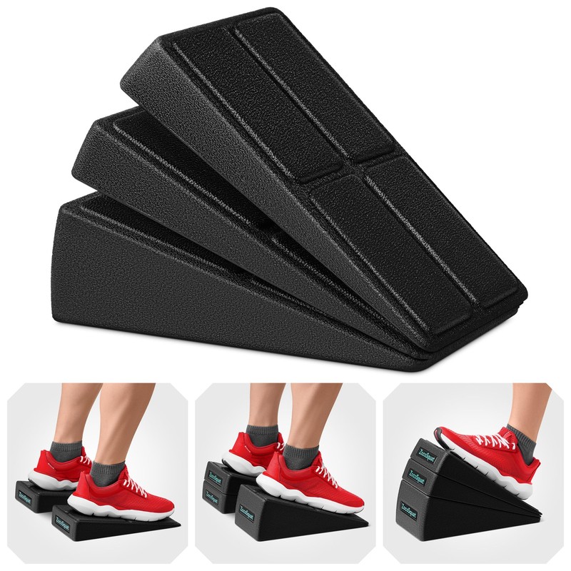 - Combine angles: use the wedges as an inclined board for squats (heels high) or as a calf stretcher slant board (toes high). Lift both feet 8.5 or 17 degrees, or just one foot at a full 34 degrees to gradually expand your range of motion