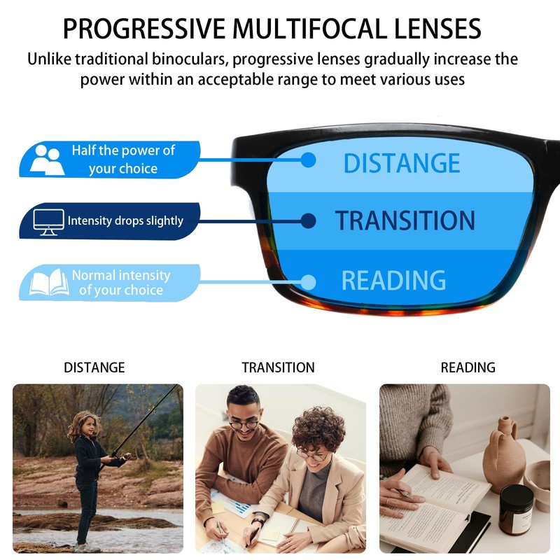 - 【THREE LEVELS OF VISION】:Progressive multifocus glasses for all your need. Top part is half-power magnification for walking, shopping. The middle part is slightly reduced power magnification for working on computer, watching TV, etc.The bottom part of the lens is full-power,used for nearly distance reading. It means that you can wear the glasses anytime and anywhere.