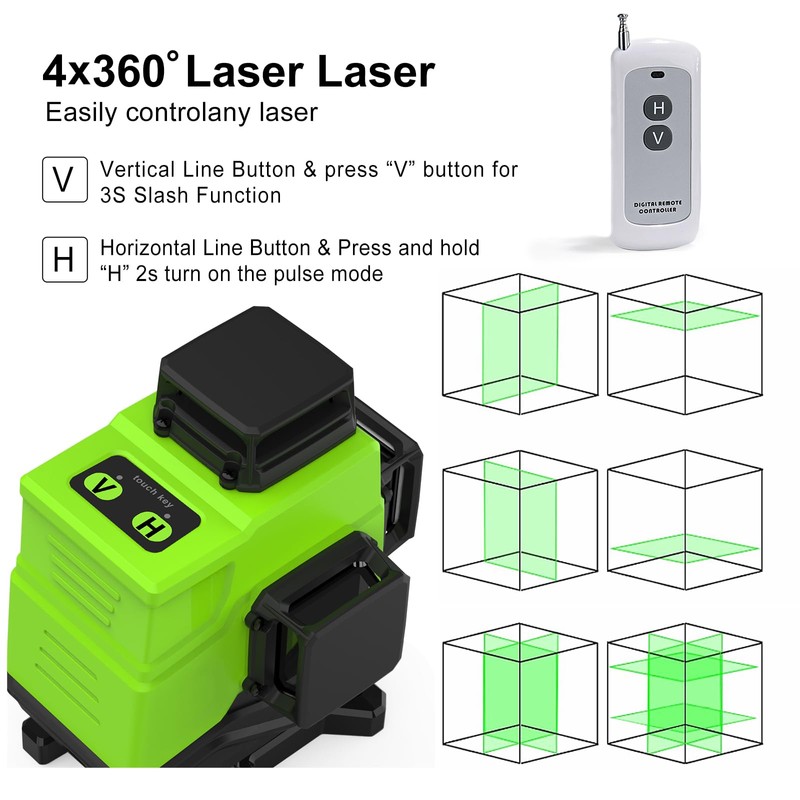 - 【TOUCH KEY & REMOTE CONTROL】This laser level can use both the touch button and the remote control in order to easily operate 15m away. LED touch indicator (H: horizontal line switch, V: vertical line switch, V: tilt mode). Note: The line mode switches every time when you short press the H/V button. 5000mAh Li-ion battery can be changed at necessary time. The adapter can also power the line laser level separately.