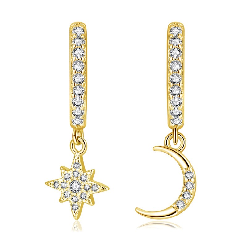 - Silver hanging earrings: the earrings are very pretty and simple. The combination of round hoop earrings and irregular star and moon pendants is stylish and gets a beautiful look thanks to the zirconia accents. This design is not only chic, but also has a strong visual impact that will make you stand out from the crowd.