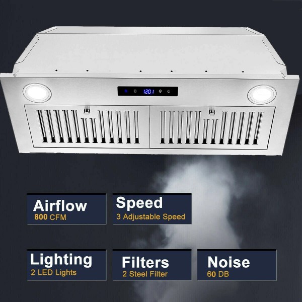 Soft Touch Control PanelSmart digital soft touch on range hood board always do a good job no matter it is above hot temp stove or control by wet hands. You can trust it to work no matter what time to use it. | Permanent Stainless Steel Baffle Filters#430 stainless steel: With good corrosion resistance, can be used many years Quick-remove switch: Filters can be take off in 3 second. Dishwasher safe: Say goodbye to hand cleaning, save time | Powerful Efficient MotorUltra Efficient motor: Longer service life High speed: Provide 800 CFM suction Quiet operation: More quiet kitchen Low energy consumption: Work better in same power |