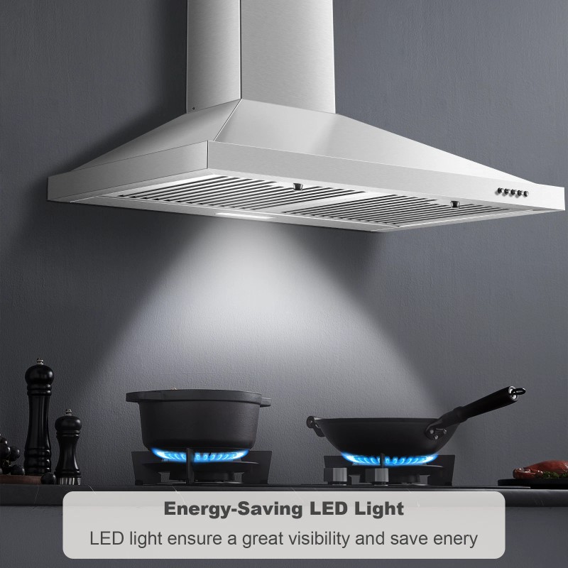 - Vent hood with humanized design: Wall mount range hood comes with two stainless steel baffle filters to absorb grease and smoke. Easy to remove and clean, dishwasher safe. A long energy-saving LED light enough to illuminate the entire stove