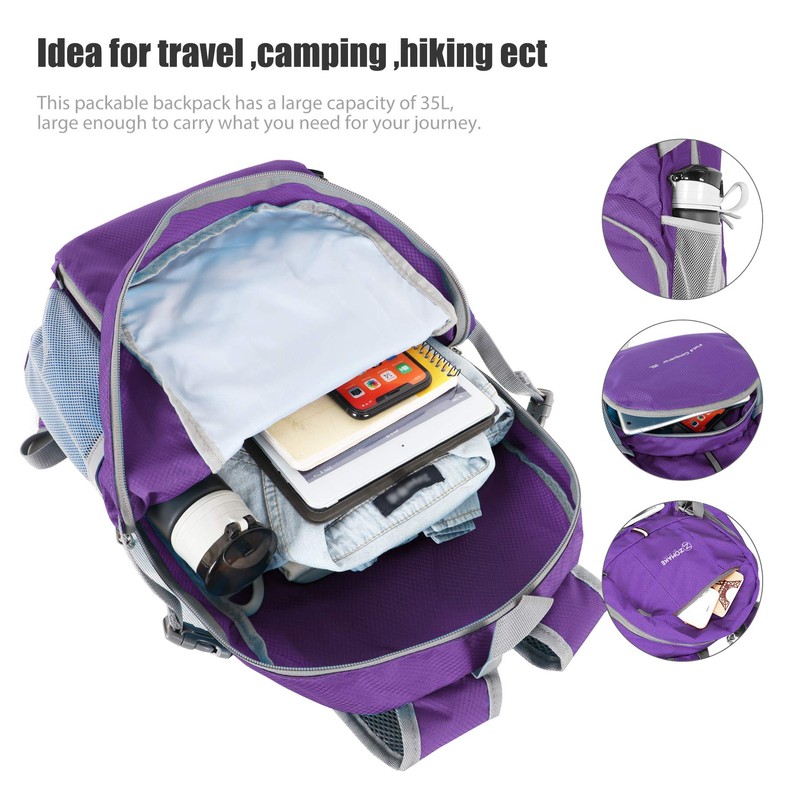 - ROOMY CAPACITY -- Designed with 35L capacity, this travel backpack is suitable for both day and week long trips. It has one main compartment, two zipped front pockets, two side pockets as well as external attachment points. The foldable bag is roomy enough for your laptop, clothes, towel, snacks, water bottle and umbrella while keeping things organized and separated.