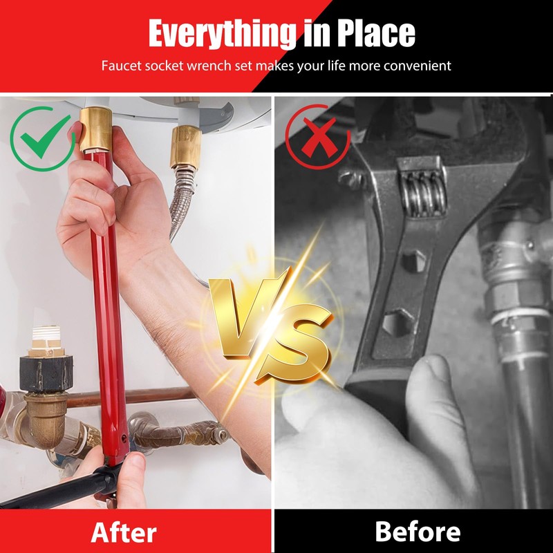 - 【Versatile Installation & Removal】Designed for both tightening and loosening tasks, the dual-function wrench securely grips rounded or stripped nuts without slippage. The ergonomic handle provides leverage for stubborn fittings, while the included sockets ensure precise alignment to prevent damage to delicate chrome finishes.