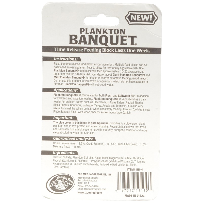 - Zoo Meds Plankton Banquet time release feeding blocks last 3 to 14 days, depending on block size