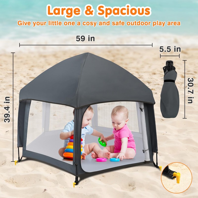 - 𝐒𝐚𝐟𝐞𝐭𝐲 𝐅𝐢𝐫𝐬𝐭: Ensuring your baby's safety is paramount to us. Our baby play pen is designed with sturdy rails, an intelligent safety lock, breathable mesh for visibility, and an UPF50+ UV canopy. This play pen for babies 6-12 months comes with 6 pegs to secure the play fence to the ground or sand, providing a secure play area for babies and toddlers.