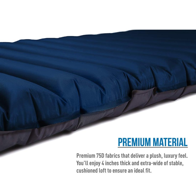 - ✅ RUGGED LONG-LASTING - 75D Polyester pongee fabric with extruded PVC lamination. This is the most durable fabric around used for military parachutes. It's waterproof and warm which will protect you from the wet ground in the most extreme conditions. This inflatable sleeping pad will be a perfect match for your tent, sleeping bag, and camping cot. which is strongest camping gear designed to last a lifetime in the most severe conditions.