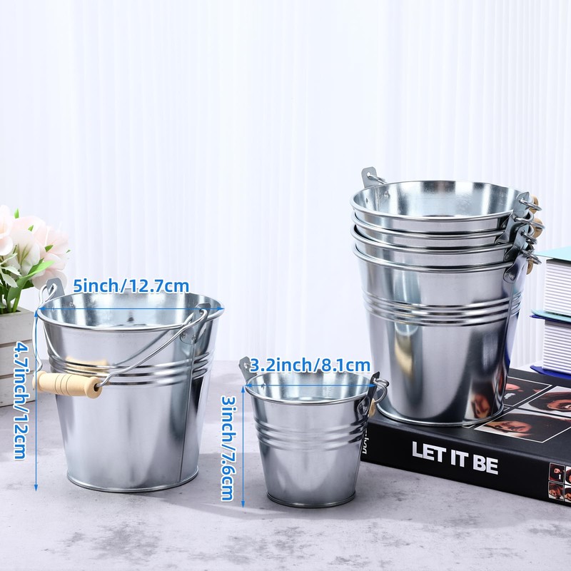 - Proper Size: the metal bucket with handle measures approx. 5 inches in top diameter, approx. 4.7 inches in height and approx. 3.9 inches in bottom diameter, appropriate size to facilitate your various use demands, and you can fill it with ice cubes to keep your drinks or fresh snacks cool
