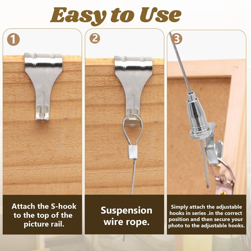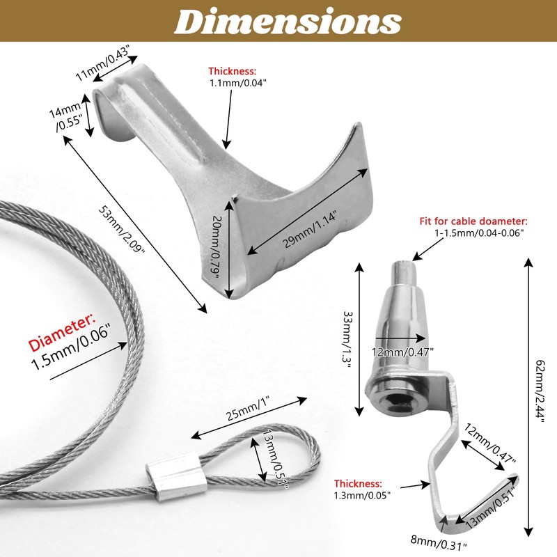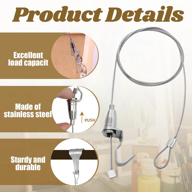 • Versatile Compatibility: Designed to work with various cable types (1mm to 2mm in diameter), this kit adapts to different hanging setups, making it perfect for galleries, classrooms, or personal art collections.