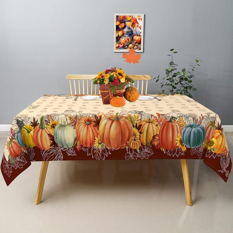 - 【Design】 Elegant one-piece cutting design with hemmed edges. The graphic of autumn tablecloth is designed with Fall Watercolor Leaves and Colorful Pumpkins, which fills your rectangle table with harvest atmosphere.