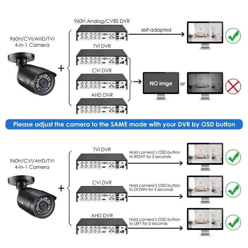 - 【2.0MP HD 1080P 4-IN-1 Security Camera】-- This is 4-in-1 TVI/CVI/AHD/CVBS Bullet Camera. compatible with 960H,720P,1080P,3MP,5MP,8MP,4K HD-TVI, AHD, CVI, and CVBS/960H analog DVRs.