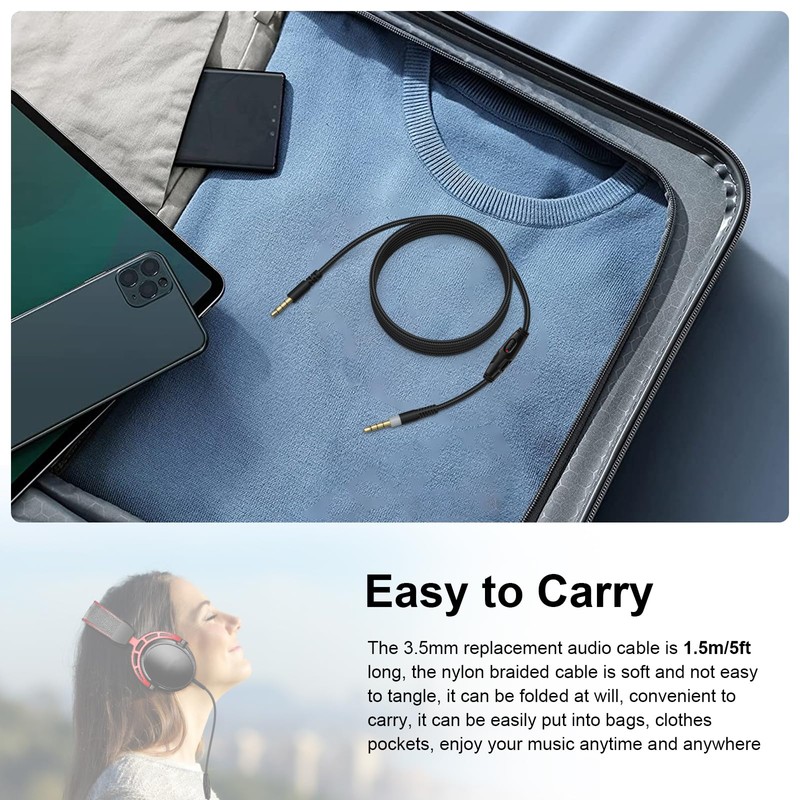 - EASY TO CARRY: The 3.5mm replacement audio cable is 1.5m/5ft long, the nylon braided cable is soft and not easy to tangle, it can be folded at will, convenient to carry, it can be easily put into bags, clothes pockets, enjoy your music anytime and anywhere.