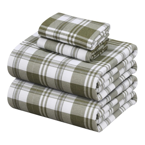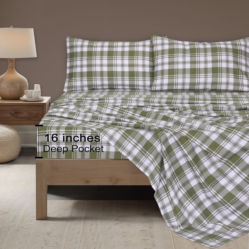 ZOYER Flannel Sheets Queen Size Set - Soft & Comfy Deep Pocket Cotton Flannel Bedding, Fitted Up to 16", Double Brushed Queen Bed Sheets, 4 Pieces, Moss