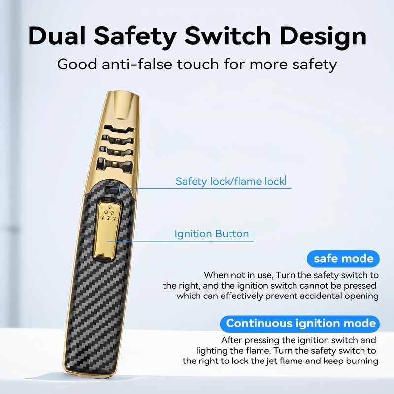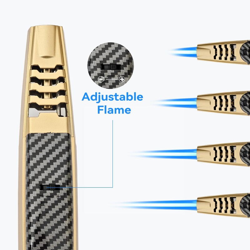 - [Durable and Safe]: Tested for 10,000+ ignitions in the lab, its high quality copper nozzle ensures durability and steady flame support, while the cooling holes and ceramic port provide maximum heat dissipation, preventing damage from high temperatures. With its dual safe lock and ergonomic design, this portable torch lighter keeps you away from the flame and potential accidents.