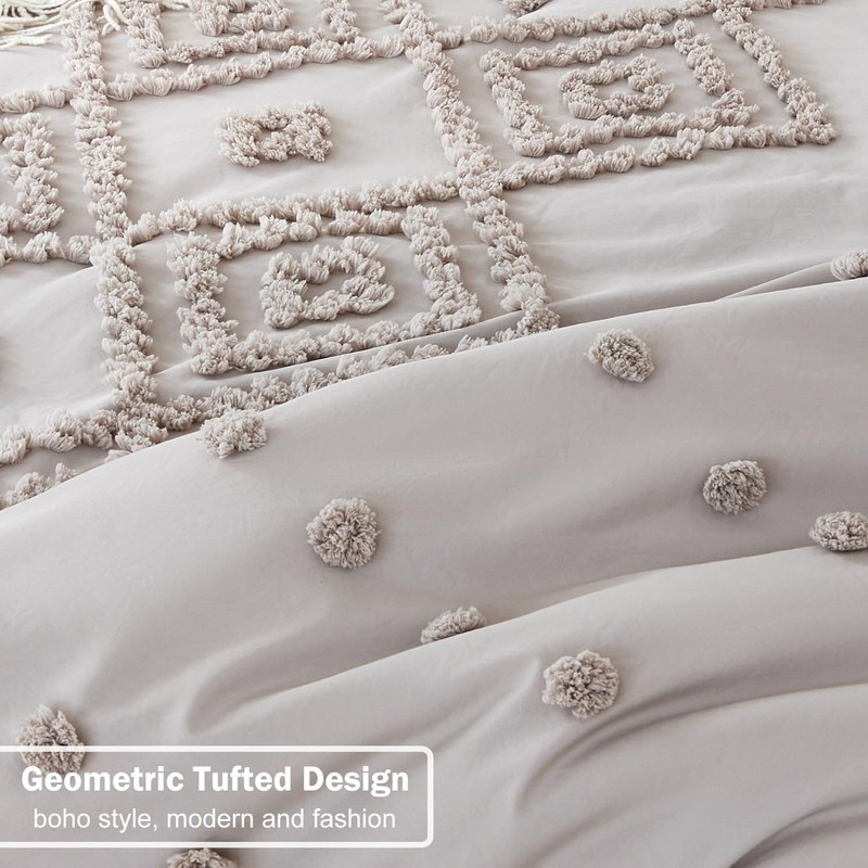 - [Tufted Embroidery Design]The stylish farmhouse queen comforter set boho with geometric pom embroidery tufts design, add a touch of elegance and charm to your bedroom decor. The khaki comforter queen size offers not just the possibility of matching a variety of bedroom styles, but the easy, clean, and cozy feels you've been longing for. 3 Pieces Gray Bedding Sets Queen: 1 Comforter 90"×90", 2 Envelope Pillowcases 20"×30".
