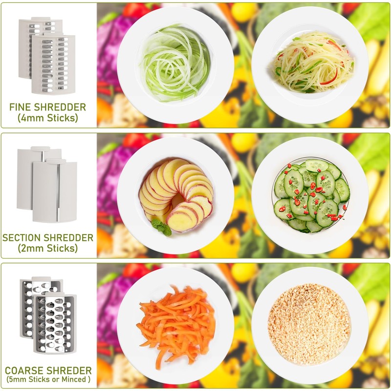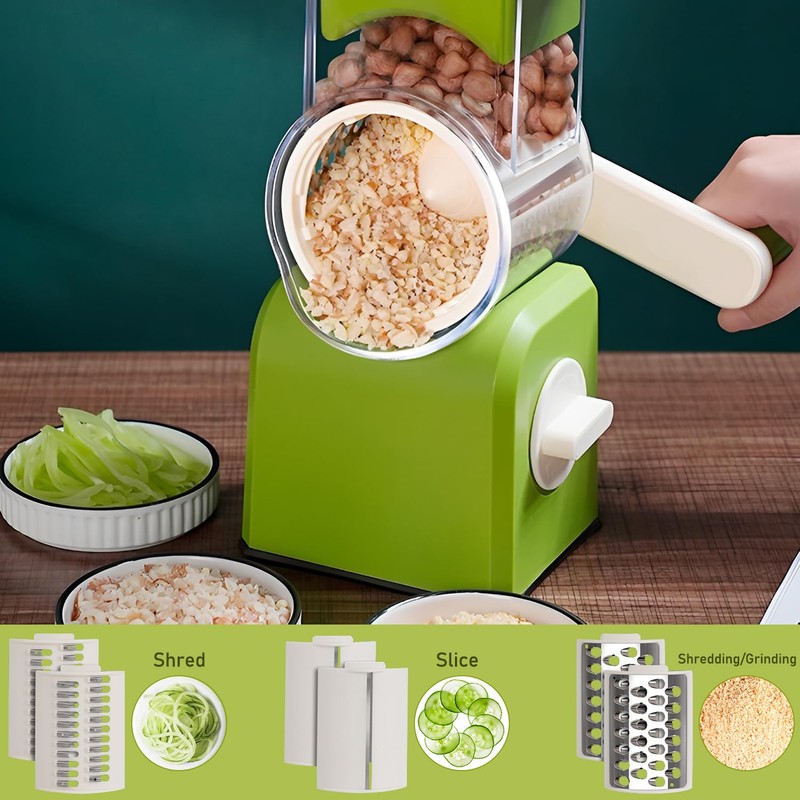 - 3 in 1 Vegetable Cutter: This stainless steel rotating chopper is a brand new 3 in 1 combo set: cutting knife, shredding knife and shredding knife for cutting cucumbers, zucchini, potatoes, carrots, peanuts, walnuts, biscuits, cheese, nuts and chocolate, making it an indispensable tool in the kitchen.