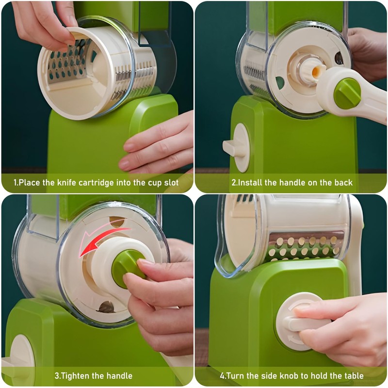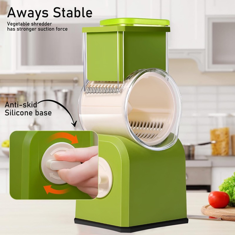 - Easy to use and clean: this rotating vegetable cutter has a powerful suction base, which provides stability and grip by pressing and turning the drum into the "locked" position. The blades of the drum gently cut through the food when the handle is turned. All attachments are removable and can be washed in tap water. Also dishwasher safe.