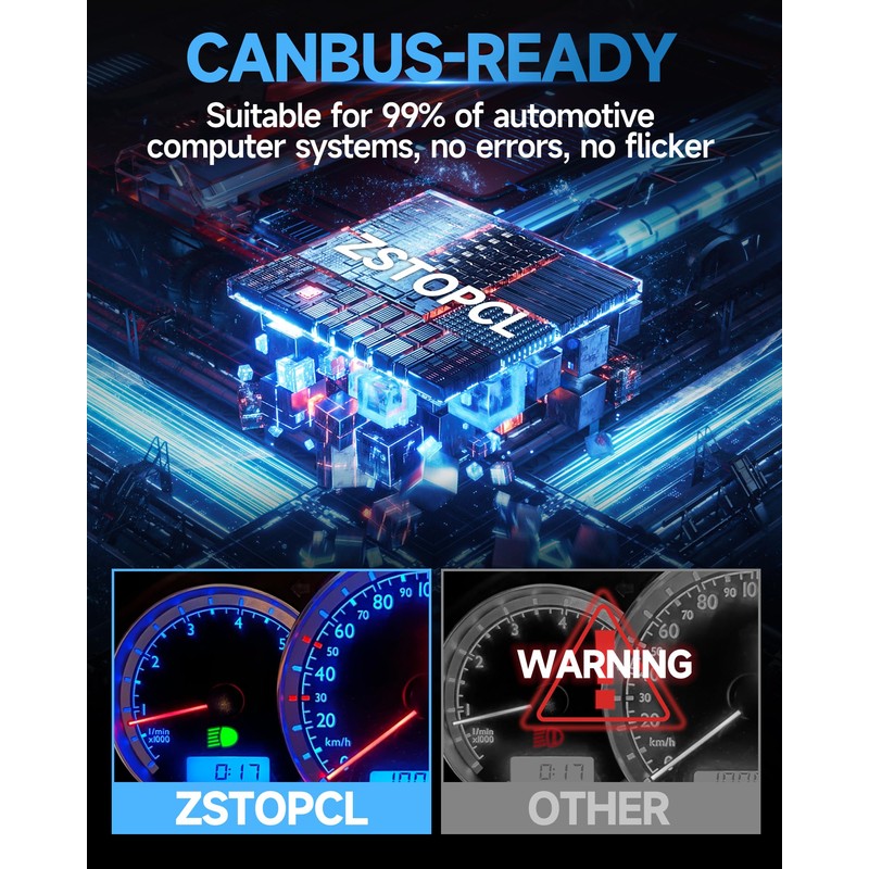 - 【Upgraded 700% Brightness】ZSTOPCL latest 6000K cool white light bulb adopts a double-sided 16pcs CSP Chips design, with a full light pattern and no black spots. It can up to 17000LM, which is 700% brighter than the original car halogen lamp, making your night driving vision clearer and enjoying the fun of night driving