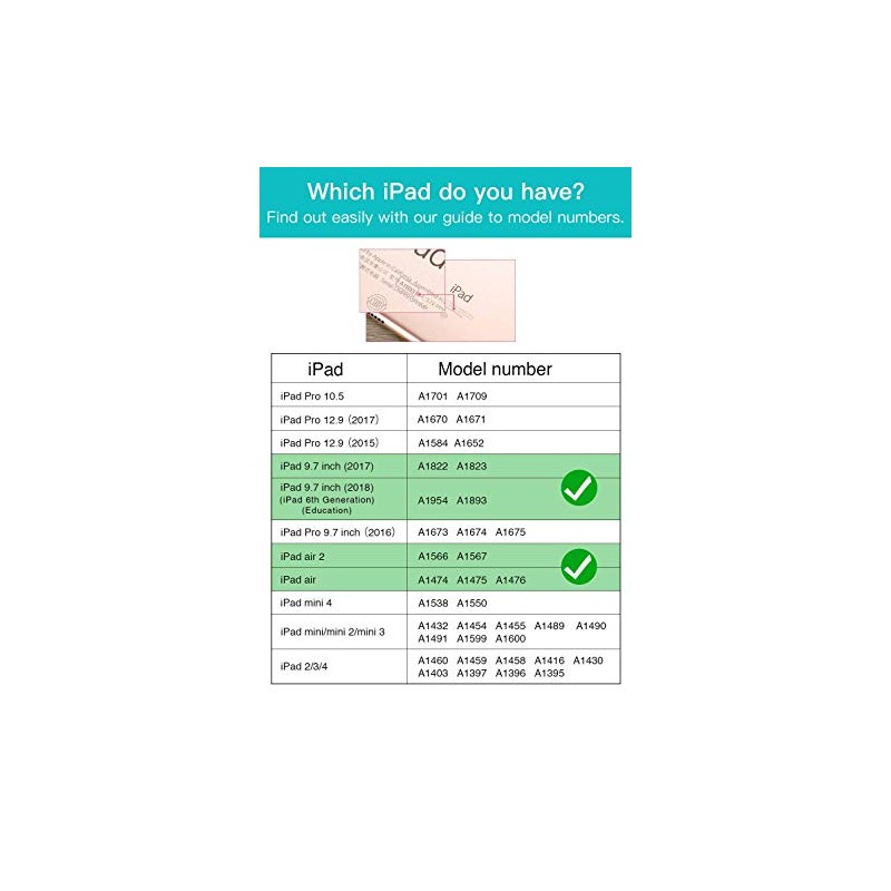 - PLEASE NOTE - Exclusively designed for iPad 5th Generation 9.7 inch 2017(A1822/A1823), A10 2018 Education version 6th Generation(A1893/A1954), iPad Air 1(A1474/A1475/A1476), iPad Air 2(A1566/A1567), will NOT FIT other iPad models.