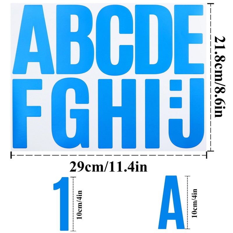 • Package: The package comes with 9 sheets of letter stickers from ‘A’ to ‘Z’, each letter contains 3 pieces. and 3 sheets of number stickers from 0 to 9, each single number has 3 pieces at same. The color is LIGHT BLUE.