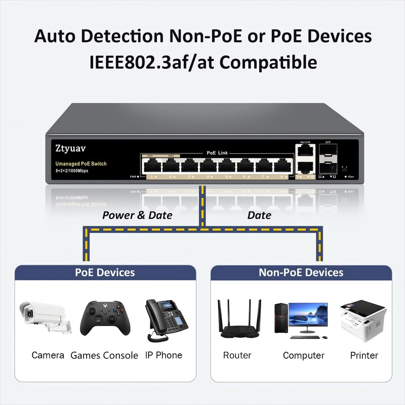 Ztyuav 12-Port Full Gigabit Unmanaged PoE Switch with 8 PoE+ Ports @120W, 2 Uplink and 2 SFP Slots-IEEE802.3af/at, QoS, PD Auto-Detection, VLAN Mode, Metal Fanless Network Switch Plug & Play