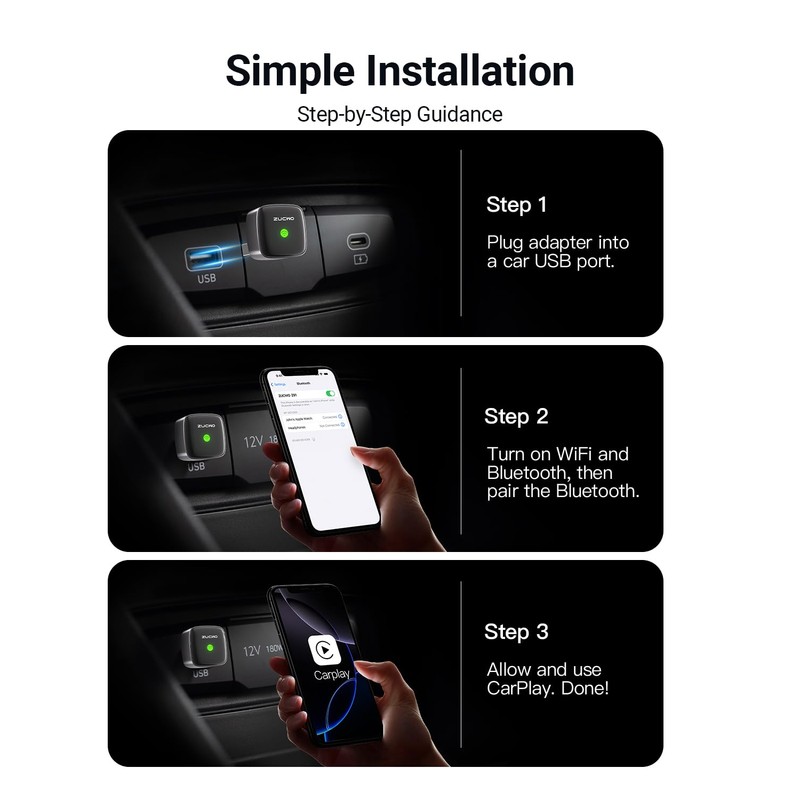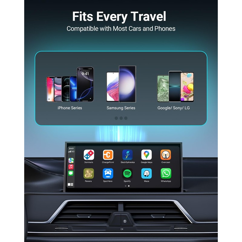 • Important Compatibility Notice – This adapter is designed for vehicles with factory-installed wired CarPlay or Android Auto systems. It converts these wired connections to wireless functionality. Compatible with over 800 car models (2016 and newer) and requires phones running iOS 10+ or Android 11+. If you're unsure whether your vehicle is compatible, please send us your car model and phone brand, and we’ll be happy to assist you.