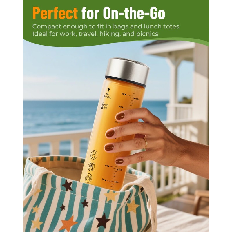 - SLEEK AESTHETIC DESIGN AND DISHWASHER SAFE: The slim, skinny, compact, lightweight and portable design glass bottles fits perfectly in your hand, means you can travel with and take your glass juice jar with cap everywhere, perfectly for garden parties, homemade drinks, picnics, school, work, gym, fitness, yoga. Easily store in the fridge, backpack or car cup holder, convenient for using at home, in the office, outdoors and on-the-go.