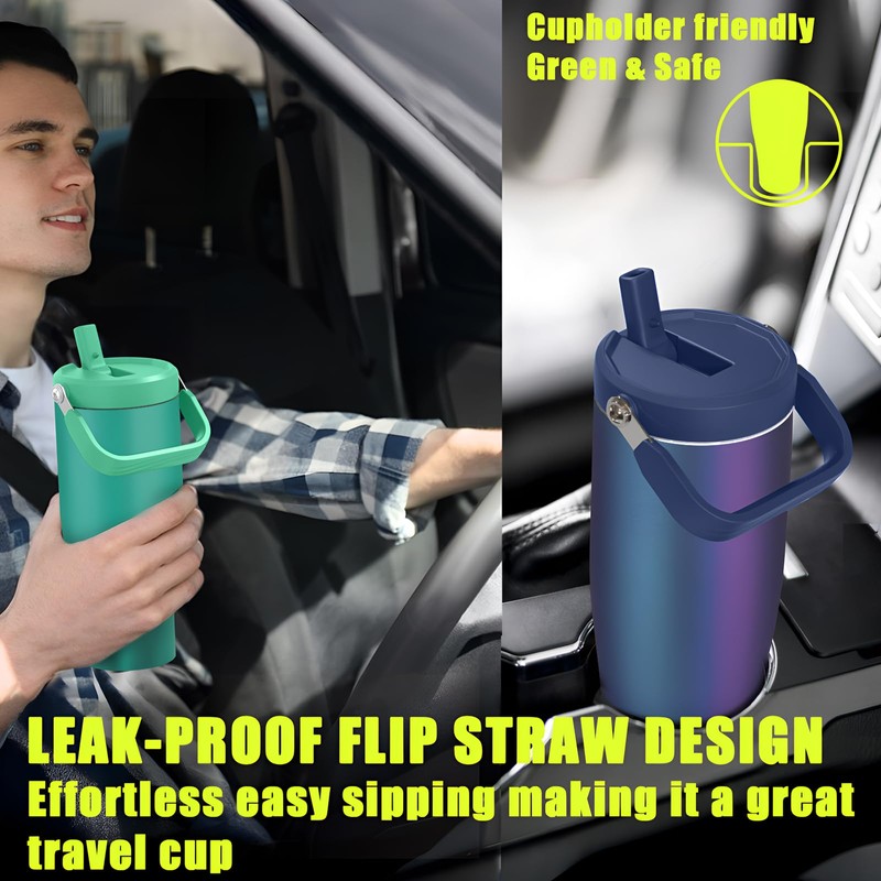 - FULLY LEAK PROOF LID AND EASY CARRYING TOP HANDLE: The insulated stainless steel tumbler is designed with a flip-top, screw-on closure lid to prevent unwanted spills, a ergonomic, rotating handle lets you quickly grab this tumbler with straw and go.No more worry about spillage when your threaded big tumbler tipps over, just need to snap the straw shut and you are done.