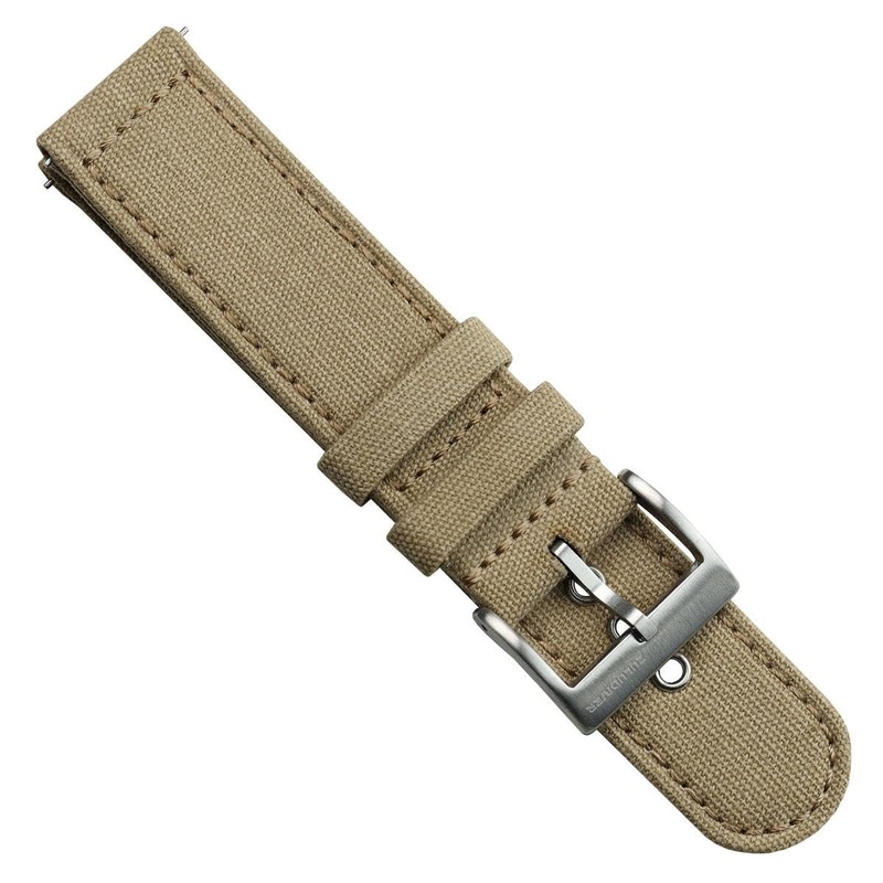 Material: 100% Cotton Canvas Sizes: 18mm, 20mm, 22mm | Length: 120/80mm Buckle: Stainless Steel, Brushed Finish Compatibility: Fits watches with standard straight end fittings Special Features: Faded vintage effect, quick-release spring bars, steel rivet eyelets