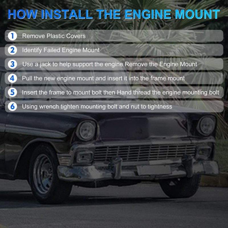 • INSTALLATION - Directly replace types, saving time and costs, for installing the motor and transmission mount: Advise using a hand torque tool to tighten the nuts. This helps maintain the integrity of the parts.