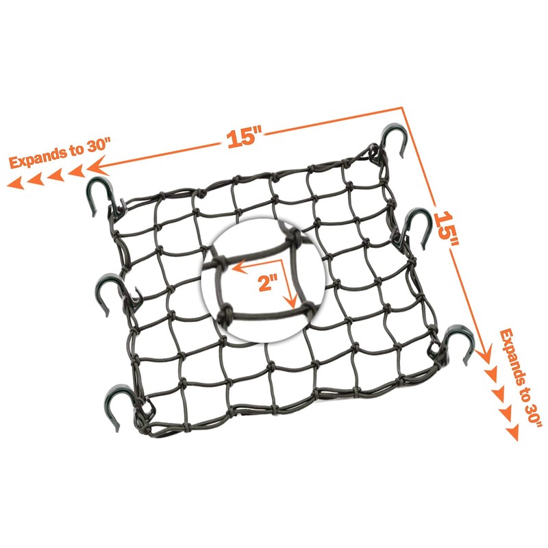 ZUOZE Small Cargo Net 15"x15" Stretches to 30"x30" with Thicken Hooks | Natural Latex Core, Tight 2”x2” Mesh Heavy Duty Bungee Net for Motorcycle Helmet, Bike, ATV, UTV, Luggage (Black, 2 Pack)